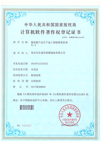• 計算機軟件注冊權(quán)登記證書——整流器產(chǎn)品生產(chǎn)加工智能管理系統(tǒng)V1.0