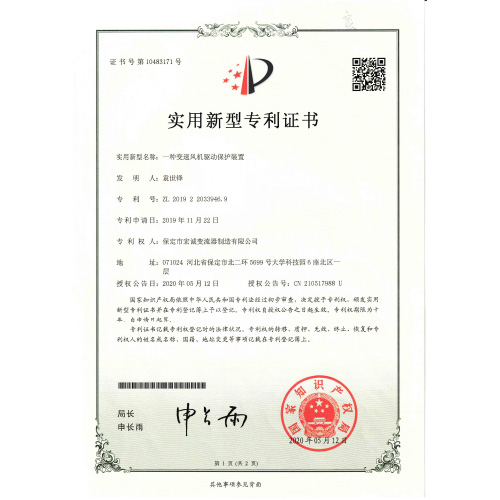 • 實用新型專利證書一種變速風機驅(qū)動保護裝置