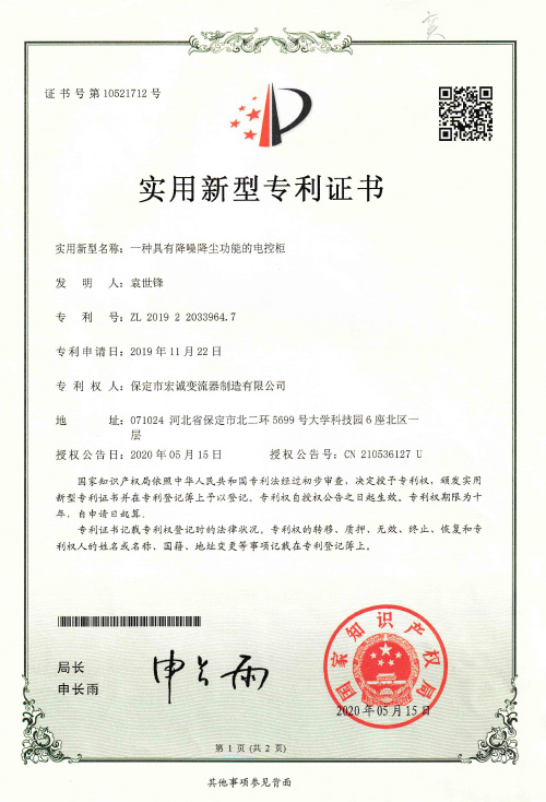 • 實用新型證書一種具有降噪降塵功能的電控柜