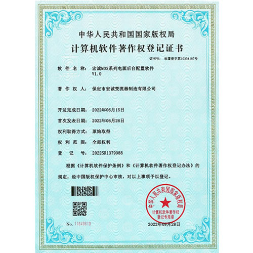 • 計算機軟件薯作權(quán)登記證書--MOS系列電源后臺配置軟件v1.0