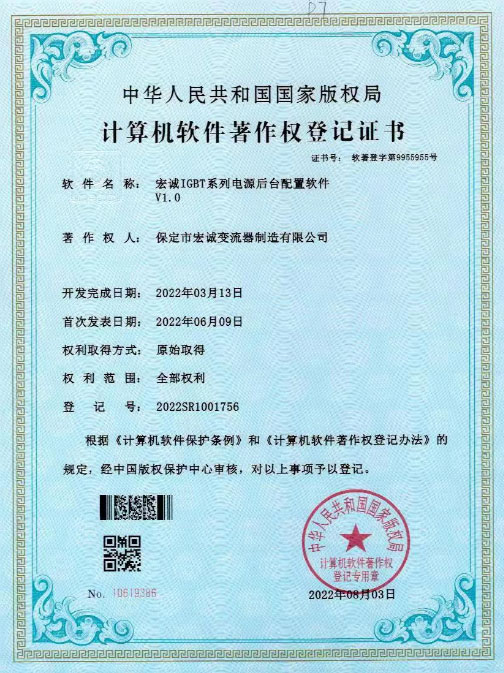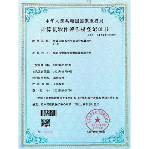 • 計算機軟件薯作權(quán)登記證書--IGBT系列電源后臺配置軟件V1.0