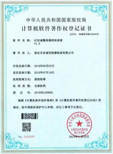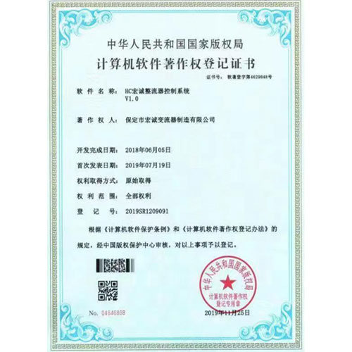 • 計算機軟件著作權(quán)登記證書--HC宏誠整流器控制系統(tǒng)V1.0