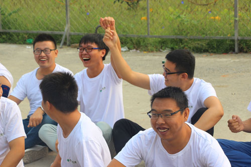 我們先進(jìn)行了拓展前的熱身活動(dòng),兩個(gè)簡單的小游戲消除了大家彼此間的陌生感,活躍了氣氛。然后,大家被教練分成兩組,并被要求在半小時(shí)內(nèi)選出隊(duì)長,取隊(duì)名,定口號(hào),繪制隊(duì)旗,選定隊(duì)歌并擺出團(tuán)隊(duì)造型。大家都集思廣益,分工合作,各顯其能。